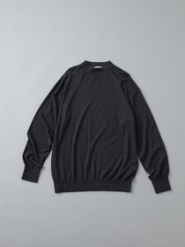 これを作る前、自分も老舗ブランドのハイゲージニットをよく着ていました。けれど、決められたサイズを選ぶといつもピッタリすぎて、どこかしっくりこない。「これがベストサイズです」とすすめられてもどうしても違和感が残るから、あえて3サイズくらい上を選んで着ていました。“一般的にいいと言われる“が自分には合わなかった。そうして理想のサイズを作り上げたのがSUPERLIGHTです。裏テーマは「大人がロンTを卒業して次に着るもの」。自分の中での“なんか違う“を言語化していくと、「ハイゲージをロンTのように着たい」という感覚です。ロンTはそもそも起毛していないからカシミヤの中でも梳毛で作り、ディテールはセーターのように見えず、毛羽立ちにくく、耐久性と機能性も高い。寸法の取り方も、一般的なハイゲージニットとは全く違います。全体に余白を持たせて、ロンTのようなバランスにしている。見た目もさらっとしていて、どこか“普通とちょっと違う“仕上がり。