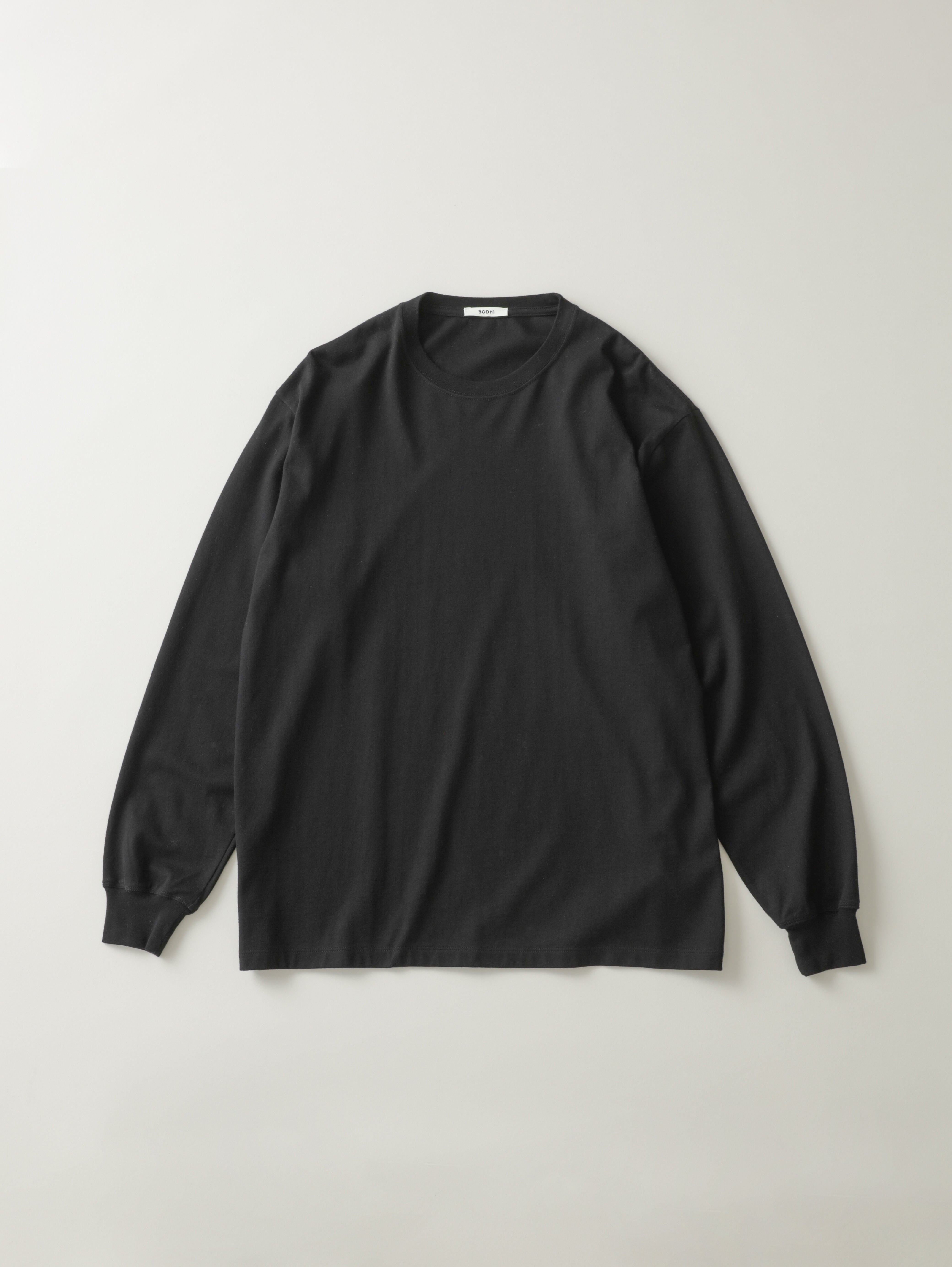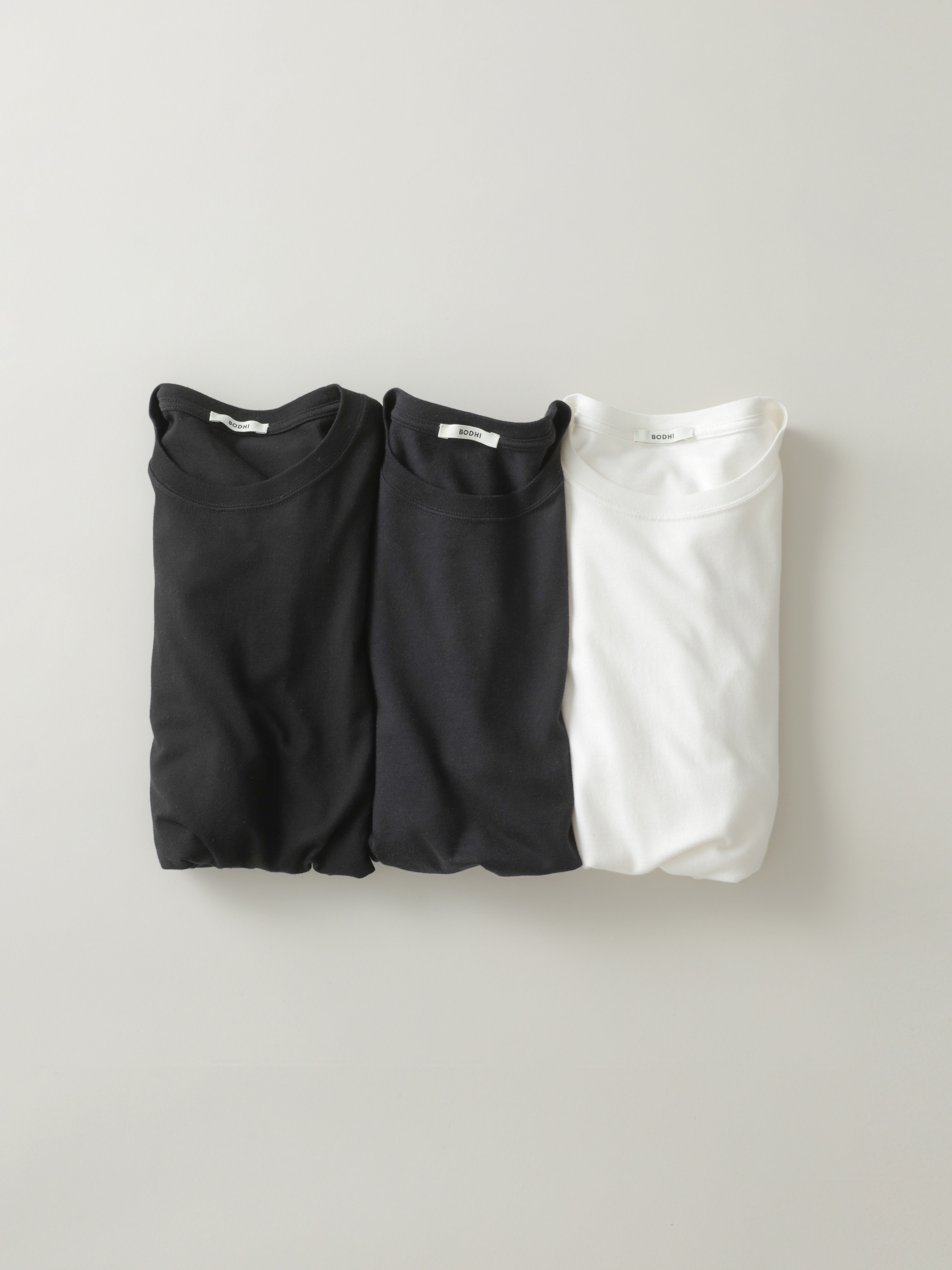 独自に開発した、コットン/カシミヤ/シルク混紡素材のカットソー。 カジュアルとドレスカットソーの中間値を表現した、1枚着でも透けずインナーにも最適なミドルオンス(6〜7Oz)のBODHIオリジナルファブリック。 吸湿、放湿性、消臭効果と、低い熱伝導性が身体を常温を保つ天然の機能性素材です。使い込むほどに身体へ馴染み、快適さと心地よさを与える一枚。