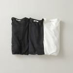 これまでずっと、とにかく様々な種類の白Tを着ては考えていました。生地の厚さ、リブ幅の大きさ、リブのテンション、身頃と着丈のバランス、ステッチの入り方etc...自分にフィットした悩まなくていい、いつも同じ気分で居られるエバーグリーンな白Tが無いかと探していました。いざこれだと愛用していても、急に素材や仕様が変更されていたり、廃盤になったり、もう悩むのはこりごりで、それならば機能的にもものすごく良いスタンダードを作ろうと形にしました。夏は一枚着で、冬はニット、スウェットのインナーに、どちらもいける絶妙な肉感にしています。コットン素材の短所は最終クタって変色して匂いが蓄積するので、ここにカシミヤとシルクをブレンドすることで、適度な肉感に柔らかさが加わり、消臭、変色軽減の効果も発揮。いつものスタイルを変えず性能が格段にグレードアップしたと思って下さい。(夏の1シーズンほぼ毎日着ていましたが、個人的には見た目も機能性も問題なし。)天然素材の特徴でもあるのですが、水に通して洗うと風合いが落ち着き、新品の時よりよく馴染みます。Tシャツ、ロンTは自分にとって、この先何十年も毎日付き合い続ける家族みたいなもの。そんな自分のモチベーションになるベースレイヤーをどうぞ。