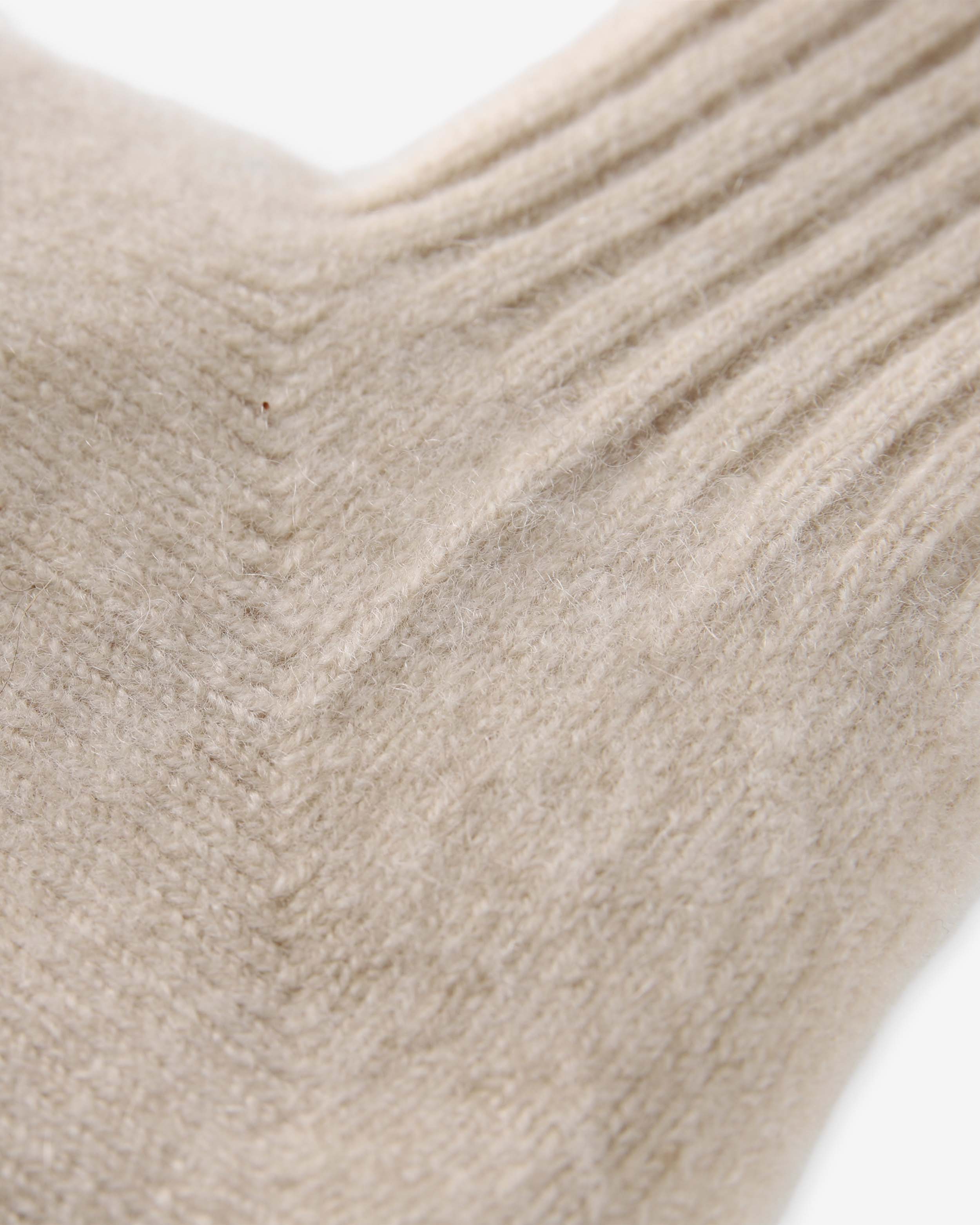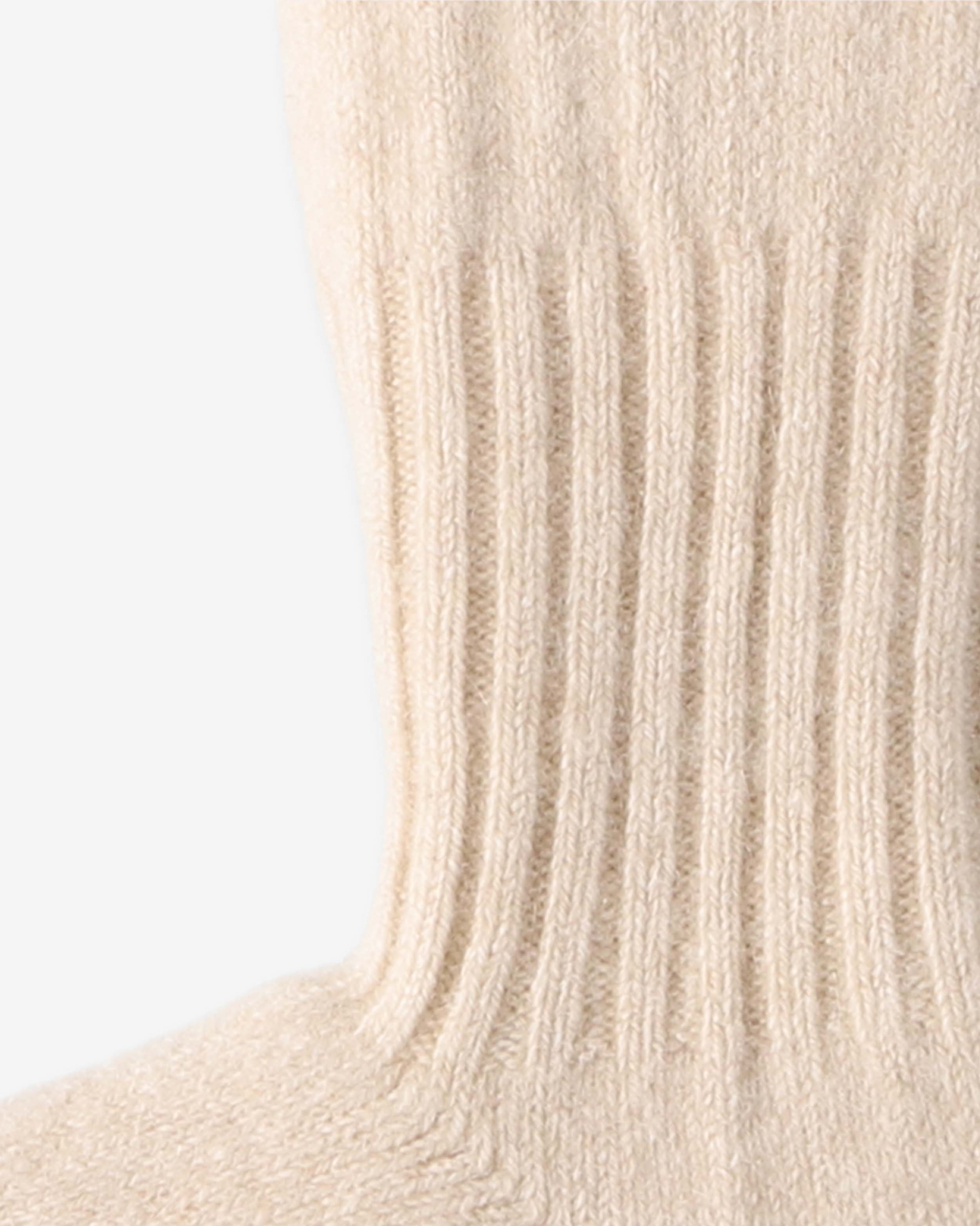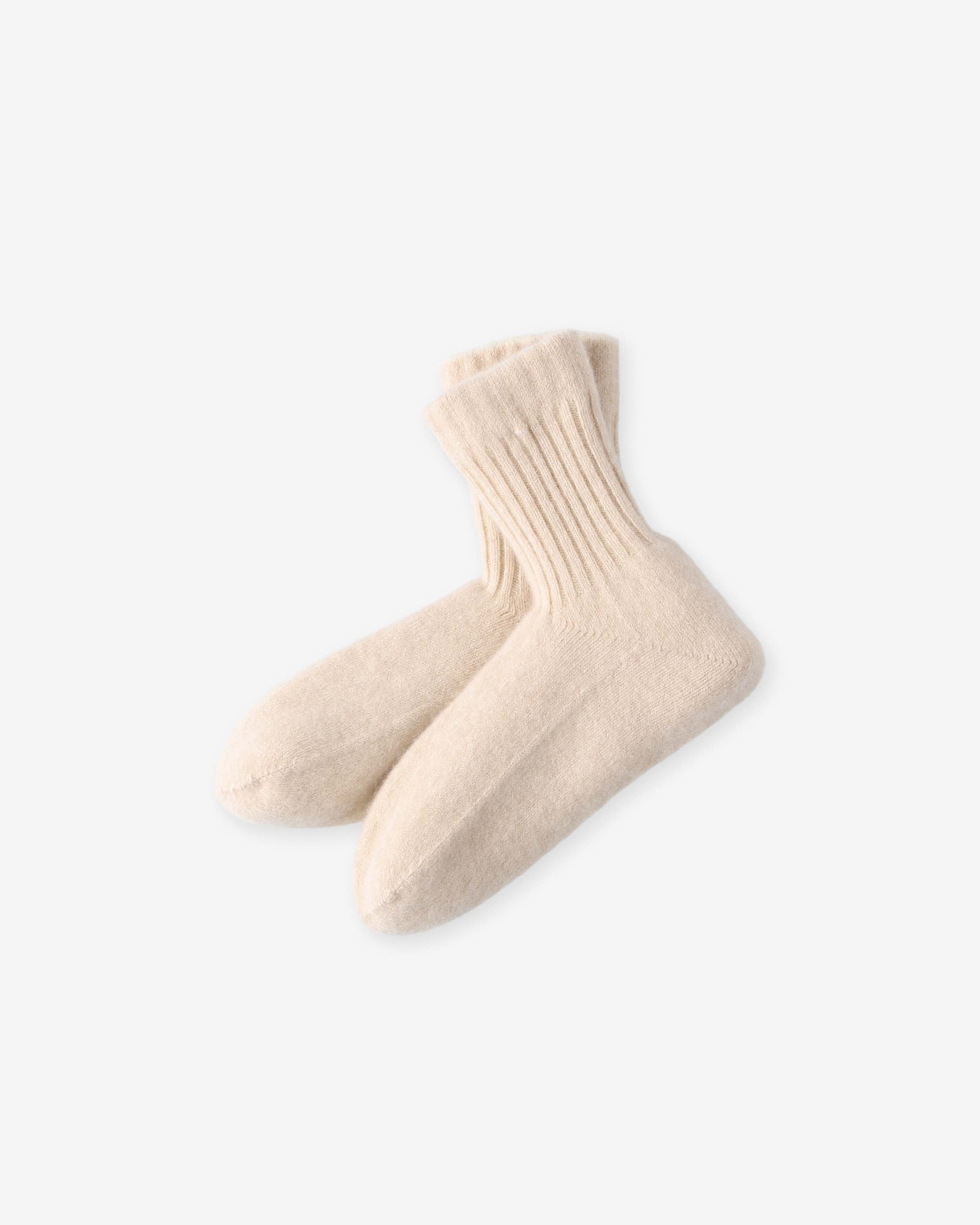 カシミヤ100%のルームソックス。外側に摩擦に強いブラウンカシミヤ、内側の肌に触れる部分にはホワイトカシミヤを使用。カシミヤ本来の通気性はもちろん、魔法瓶のようなダブルフェイス(2層)構造により特に保温性に優れています。リバーシブルでの使用も可能。伸縮性に富むため、足の大きな方でも着用できます。