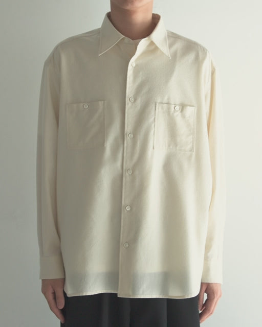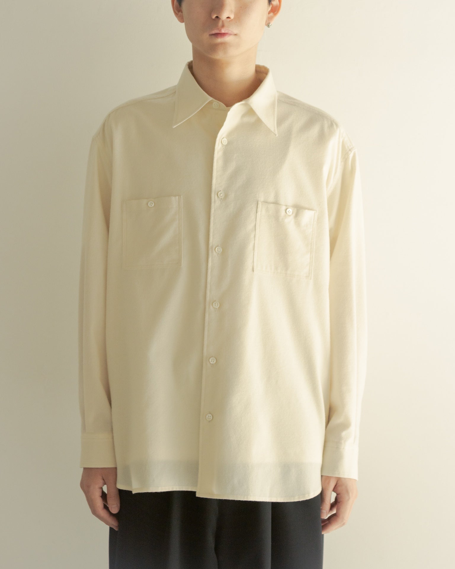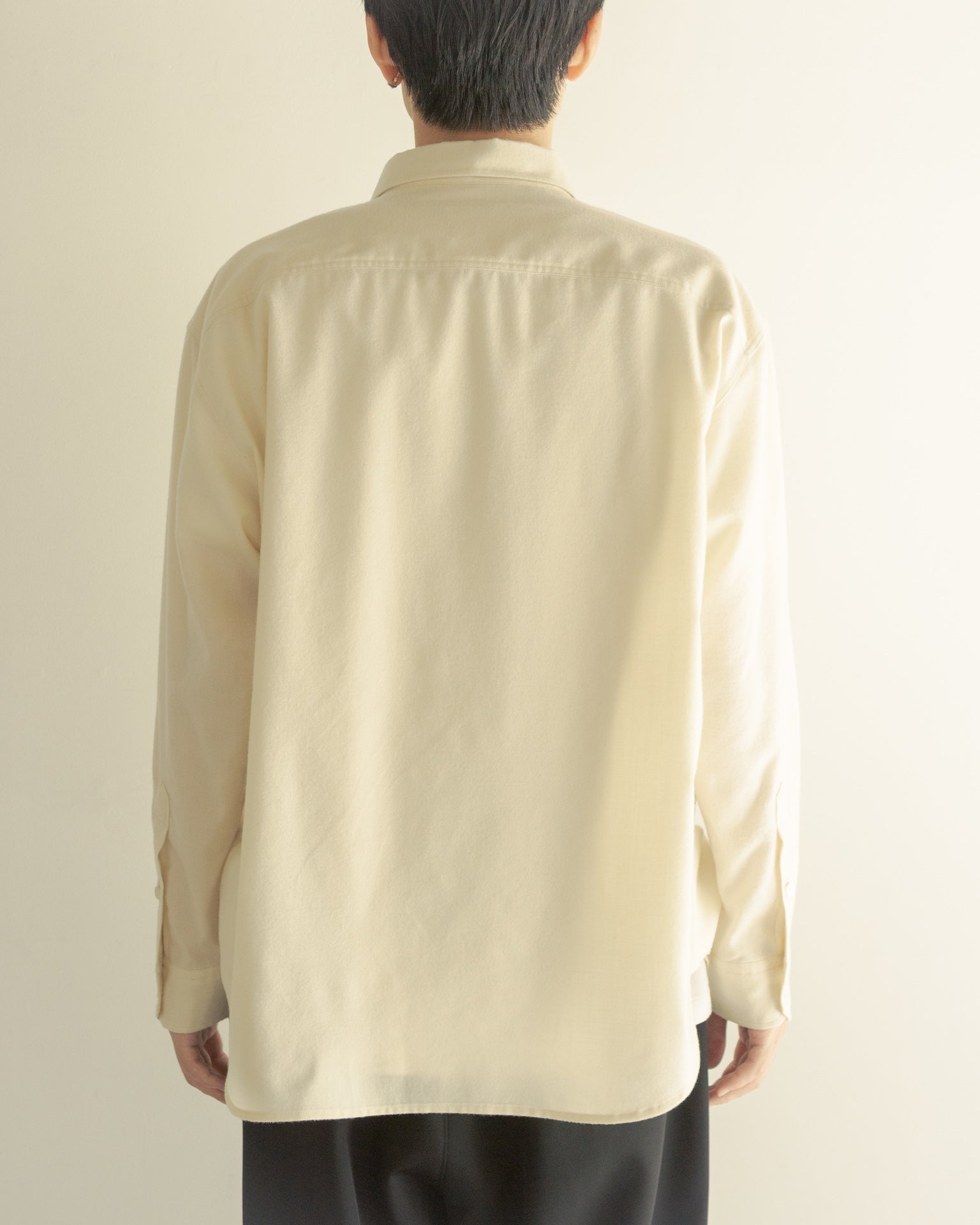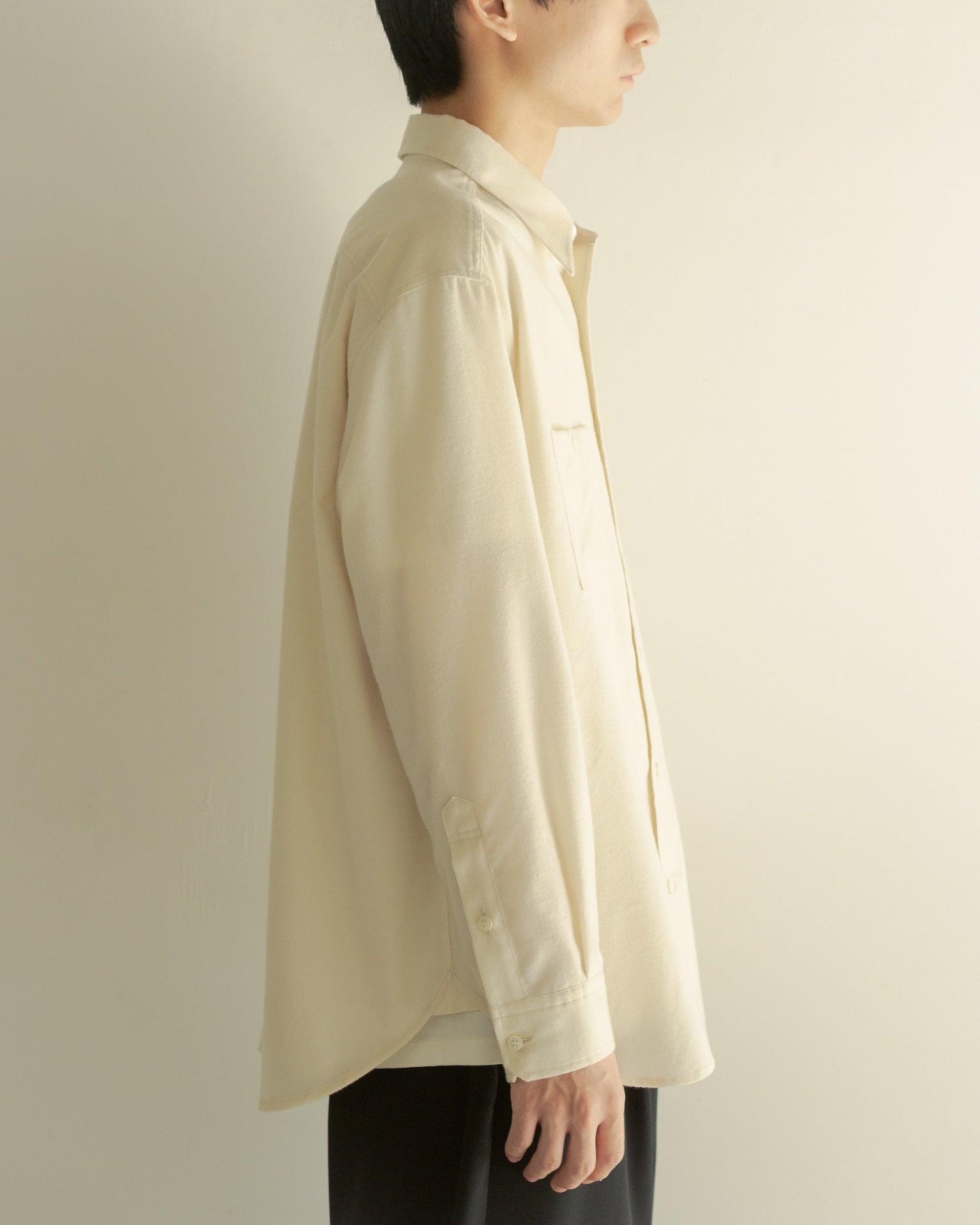 100%カシミヤを使用し、微起毛を施したライトネル素材のワークシャツ。60'S~70'Sに見られる、シャープな襟先やエッジの効いた裾のデザインなどヴィンテージディテールを踏襲しました。着込むほどに風合いが増し、表情の変化も楽しめます。肩を落としすぎない、すっきりとしたジャストサイズ寄りのシルエットで、品よく着こなせる一枚です。