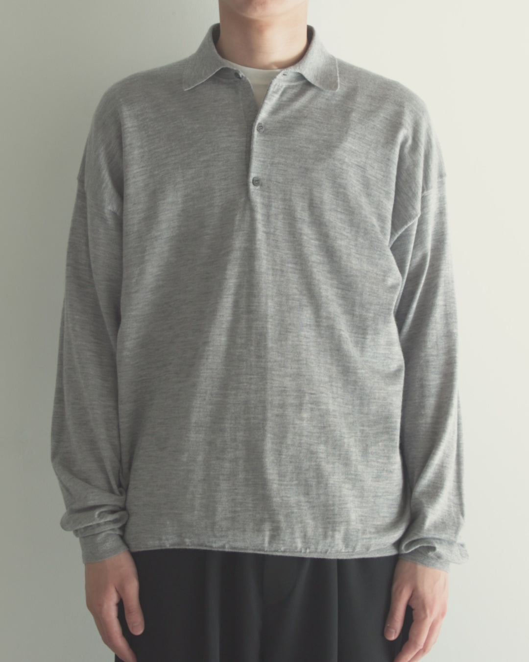 ヨーロッパでは通年着るアイテムとして、ジャージの代わりにハイゲージのニットを愛用する方も多く、特にイタリアはニットの産地である為ゲージの種類も豊富です。今回はニットのディテールの良さを残しつつ、通年愛用できる21GGで製作。糸は日本のカシミヤ梳毛糸を使用。イタリアの硬水で洗ったカシミヤは、含有ミネラルが製品の表面を程よく削ってくれるため、毛羽が取れ起毛がほとんどありません。コットンで例えるなら、スビンやギザ辺りの質感を獣毛で産み出せます。いい意味でカシミヤではないような、麻のようにシャリっとした新しい質感。ジャージアイテムは変わらず好きですが、少し落ち着いた雰囲気の、さらっと一枚でオールシーズン対応可能なカシミヤハイゲージは、生活の質を向上してくれる良きパートナーです。