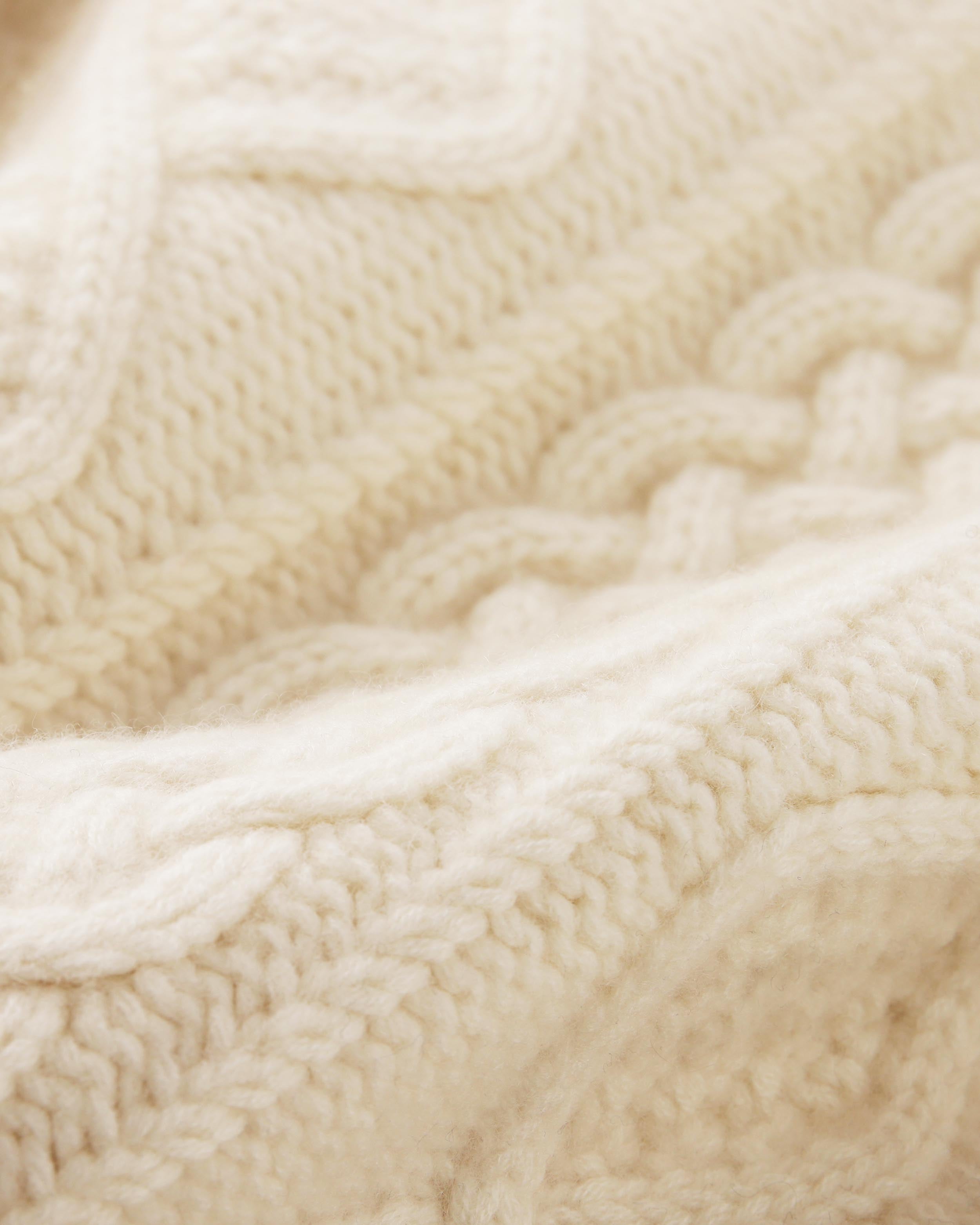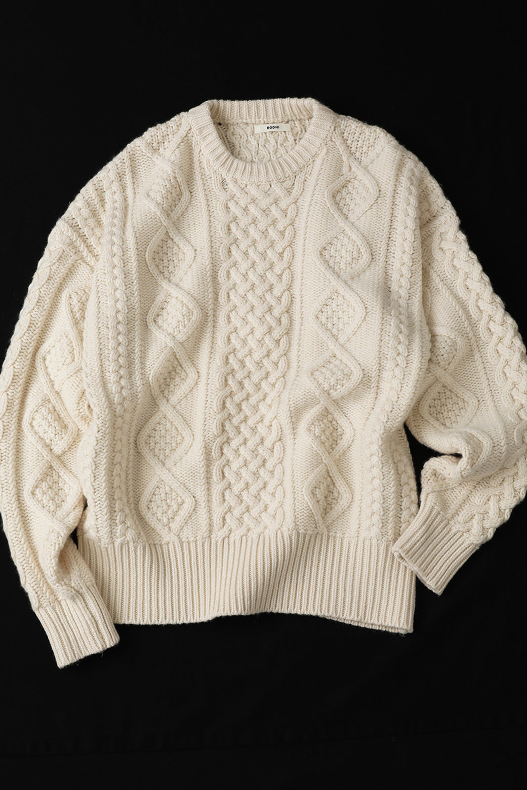 フィッシャーマンズニット(アランニット)はトラディショナルアイテムの中で押さえておきたい、工芸的魅力を感じるアイテム。元々は漁師の人がきる防寒具として作られ、ずっしりとした密度のあるウール素材が主流なので、重量感があり都会の日常ではなかなか快適に着こなせないのがウィークポイントだと思っていました。贅沢ですが、一生ものだと思ってカシミヤで作った結果、ストレスになる要素が全て消えてとても便利なアイテムに。どもくも詰まっていますが、カシミヤの軽さと通気性の良さがとても機能的です。これはいいものを作れました。ぜひ愛用して下さい。