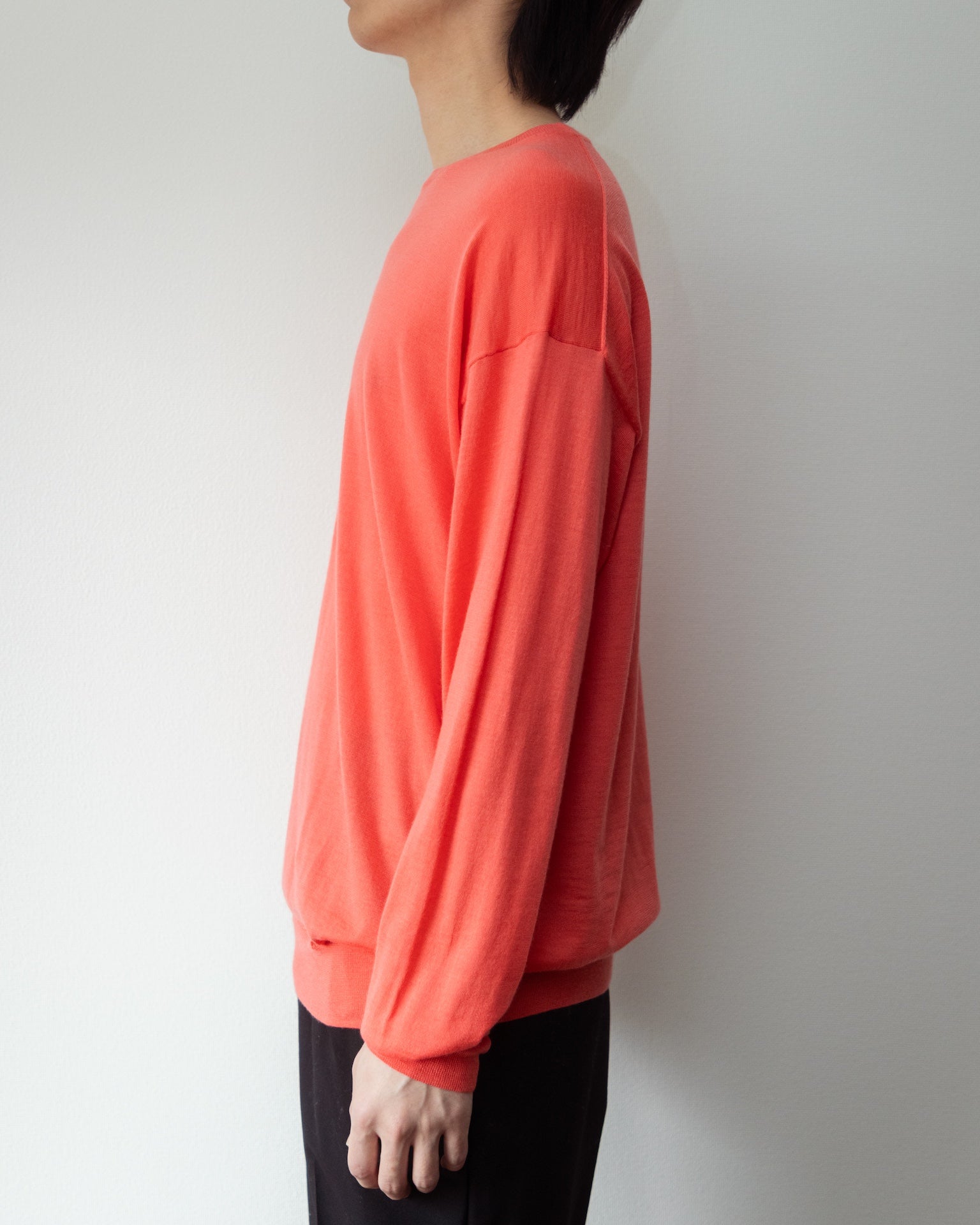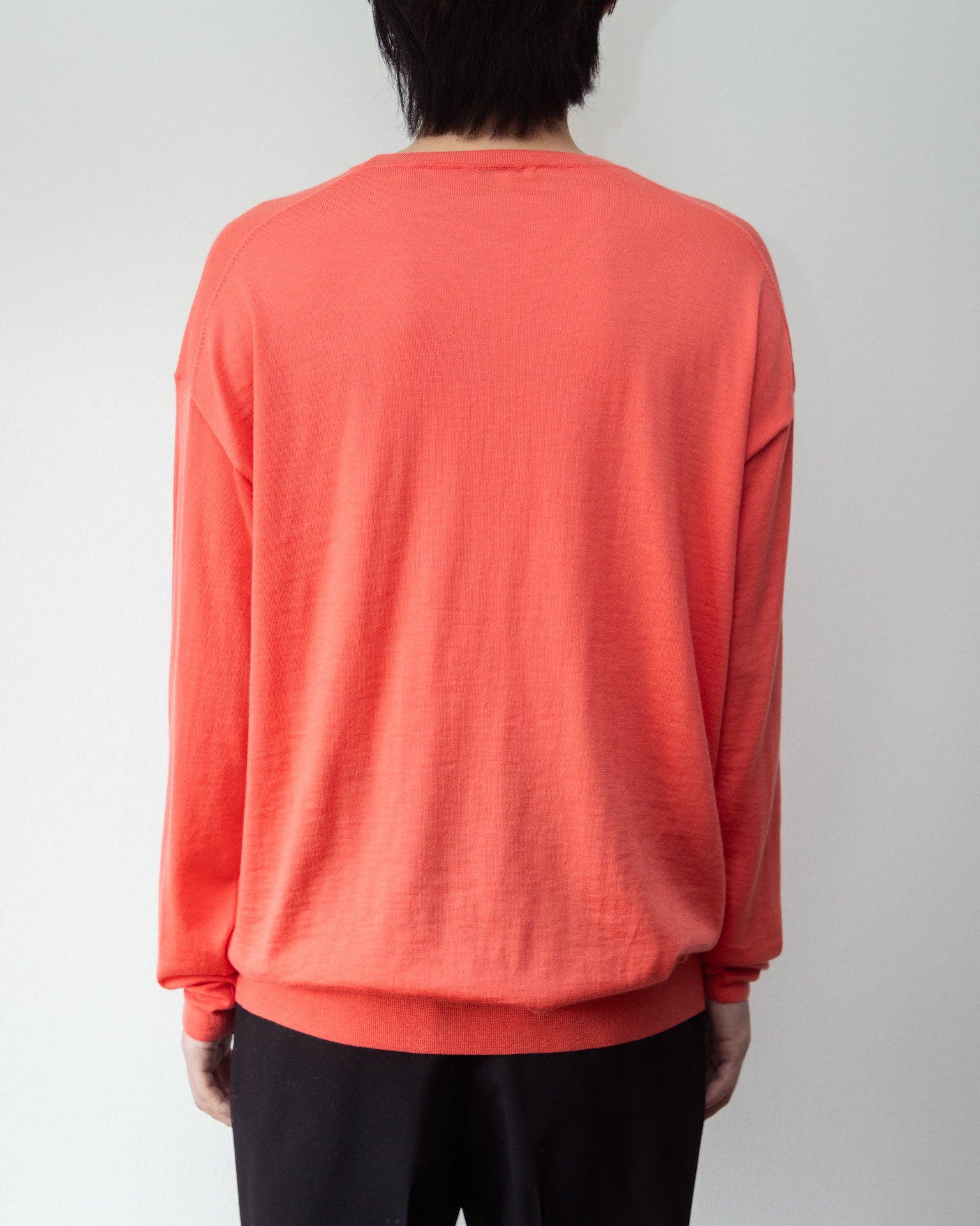 ヨーロッパでは通年着るアイテムとして、ジャージの代わりにハイゲージのニットを愛用する方も多く、特にイタリアはニットの産地である為ゲージの種類も豊富です。今回はニットのディテールの良さを残しつつ、通年愛用できる21GGで製作。糸は日本のカシミヤ梳毛糸を使用。イタリアの硬水で洗ったカシミヤは、含有ミネラルが製品の表面を程よく削ってくれるため、毛羽が取れ起毛がほとんどありません。コットンで例えるなら、スビンやギザ辺りの質感を獣毛で産み出せます。いい意味でカシミヤではないような、麻のようにシャリっとした新しい質感。ジャージアイテムは変わらず好きですが、少し落ち着いた雰囲気の、さらっと一枚でオールシーズン対応可能なカシミヤハイゲージは、生活の質を向上してくれる良きパートナーです。