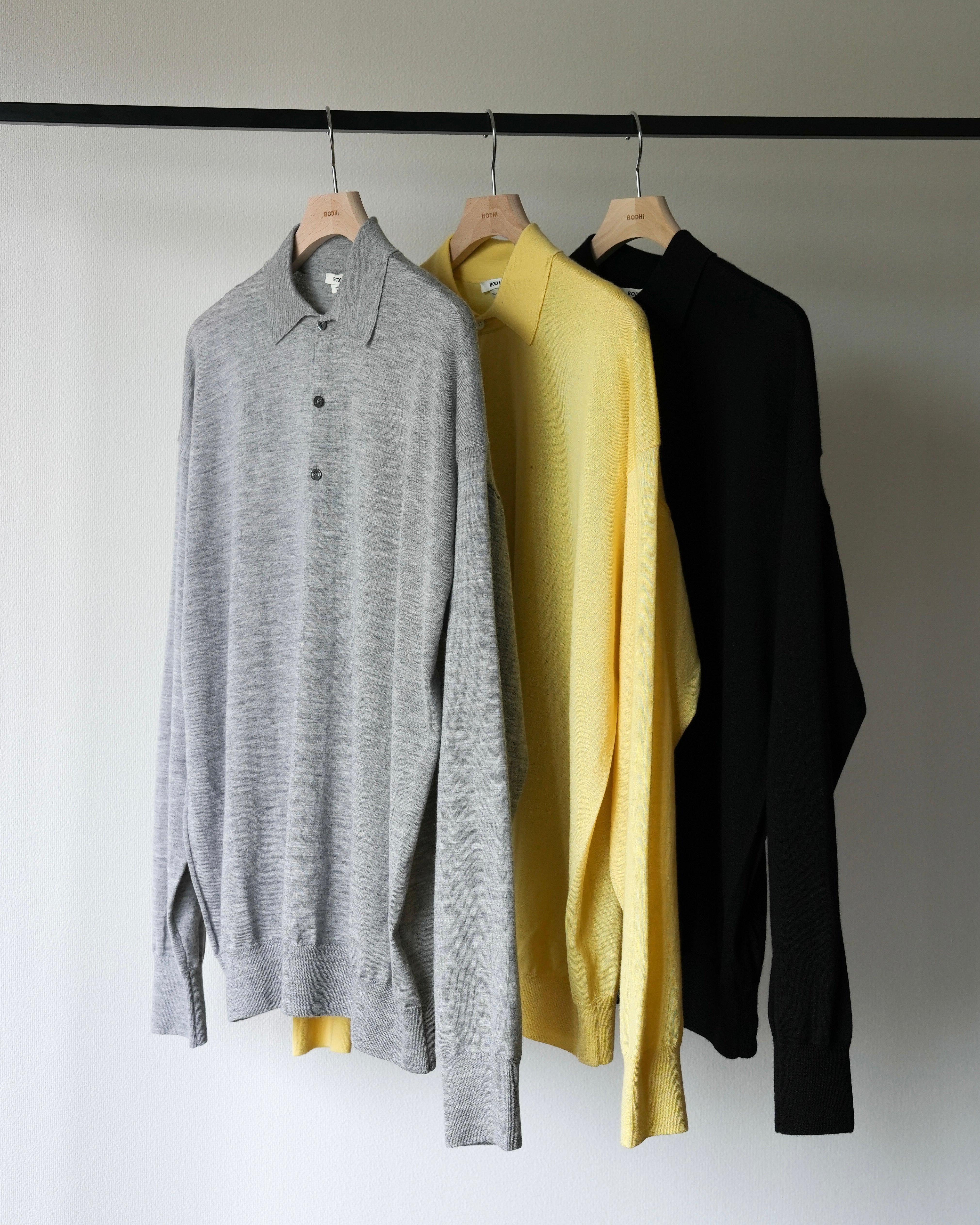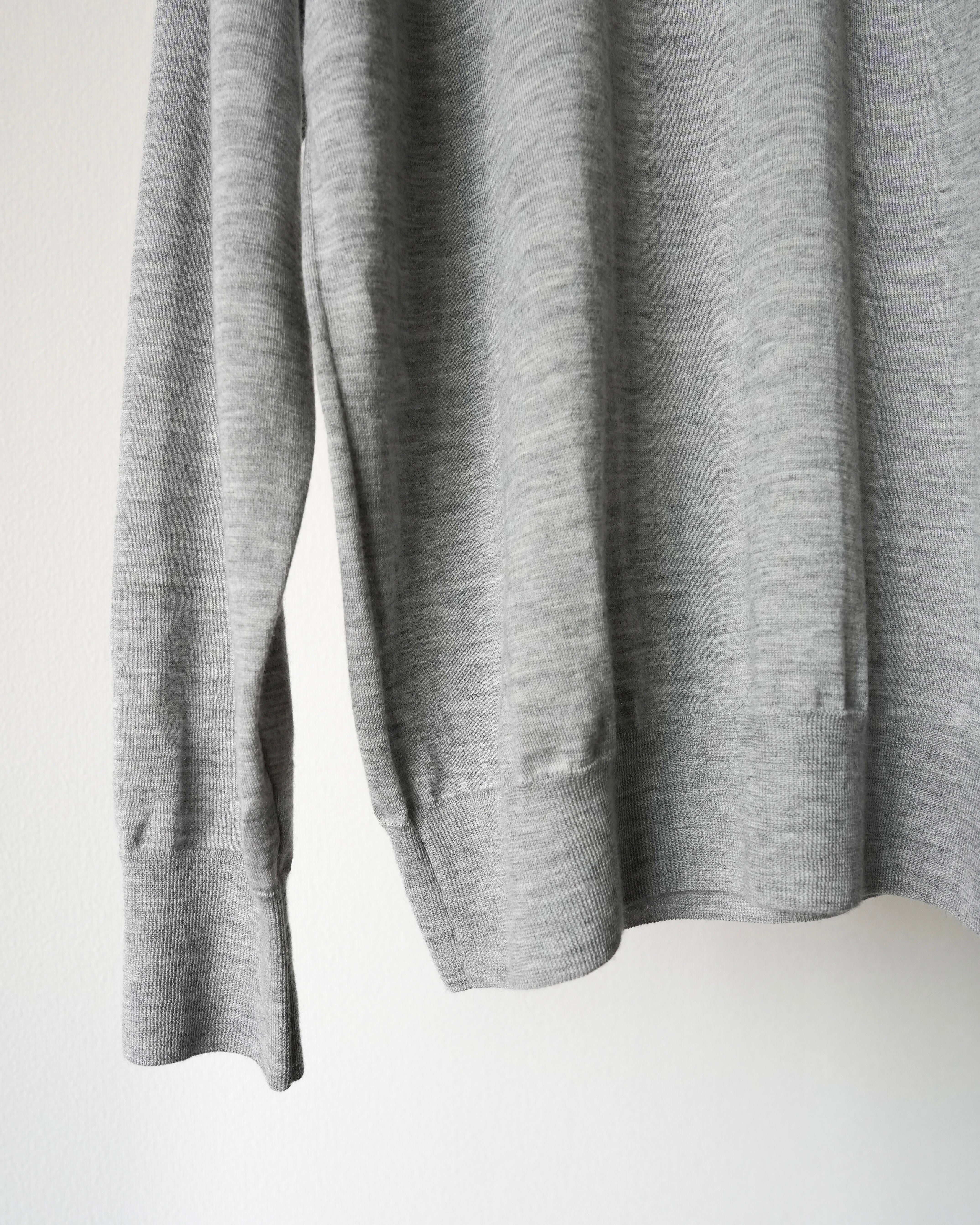 ヨーロッパでは通年着るアイテムとして、ジャージの代わりにハイゲージのニットを愛用する方も多く、特にイタリアはニットの産地である為ゲージの種類も豊富です。今回はニットのディテールの良さを残しつつ、通年愛用できる21GGで製作。糸は日本のカシミヤ梳毛糸を使用。イタリアの硬水で洗ったカシミヤは、含有ミネラルが製品の表面を程よく削ってくれるため、毛羽が取れ起毛がほとんどありません。コットンで例えるなら、スビンやギザ辺りの質感を獣毛で産み出せます。いい意味でカシミヤではないような、麻のようにシャリっとした新しい質感。ジャージアイテムは変わらず好きですが、少し落ち着いた雰囲気の、さらっと一枚でオールシーズン対応可能なカシミヤハイゲージは、生活の質を向上してくれる良きパートナーです。