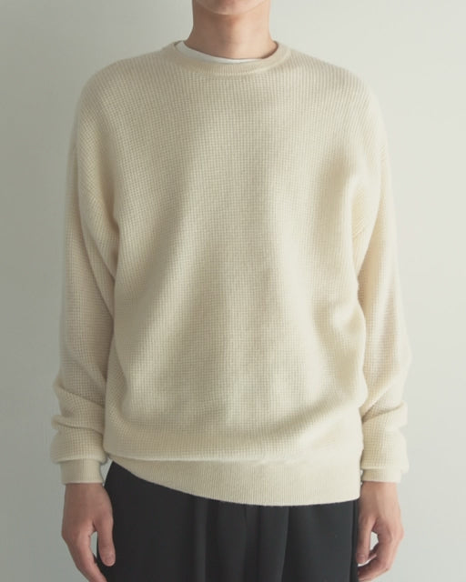 This thermal is made of 100% cashmere. Thermal used as innerwear in the military is updated with cashmere material so that it can also be used as a cut and sewn garment. The waffle structure is used to create volume on the uneven surface for greater warmth retention, and the design not only creates a comfortable feel, but also reduces contact with the skin and steaminess.