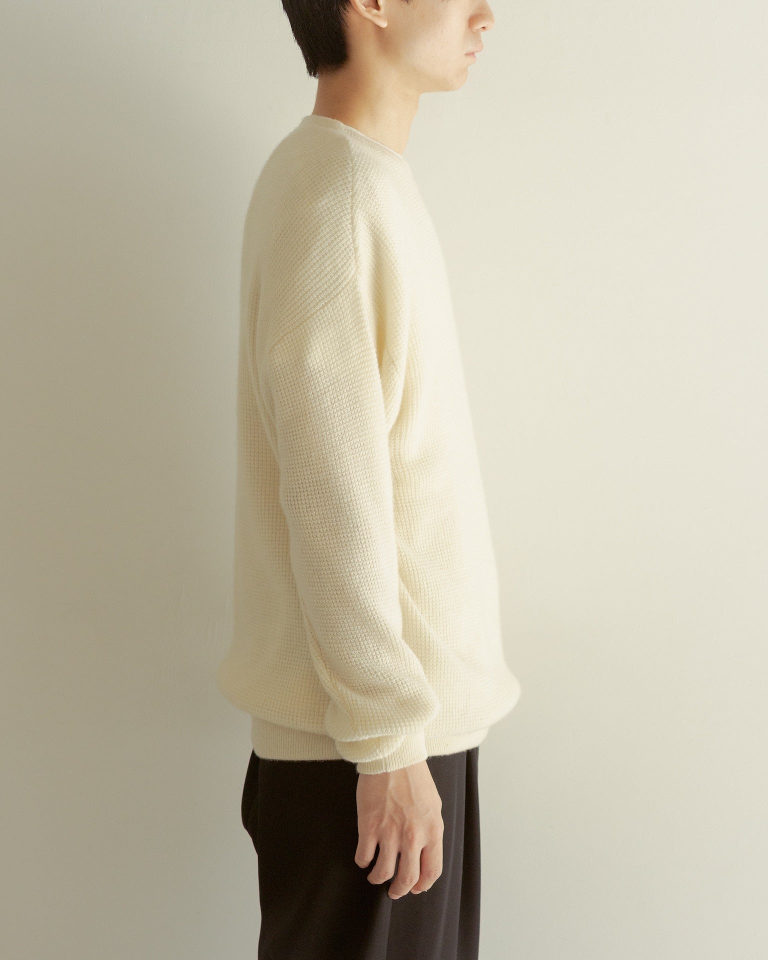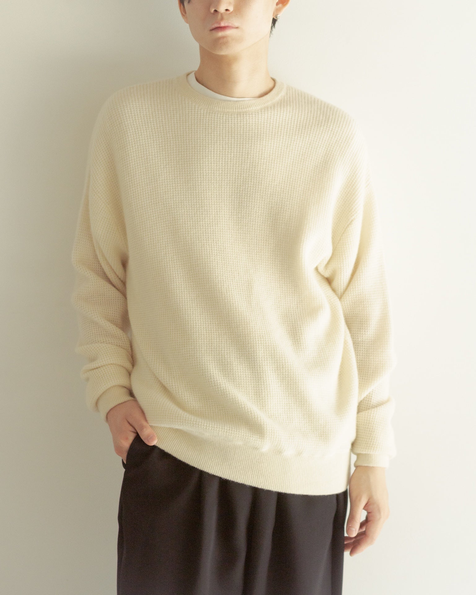 カシミヤ100%のサーマルです。ミリタリーでインナーとして使用されるサーマルをカシミヤ素材でカットソーとしても活躍できるようにアップデート。表面の凹凸でボリュームを出すことでより保温性を高められるワッフル組織を採用し、デザインだけではなく肌への接触と蒸れを軽減した快適さを実現しました。
