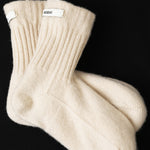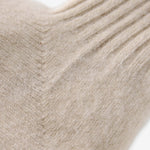 カシミヤ100%のルームソックス。外側に摩擦に強いブラウンカシミヤ、内側の肌に触れる部分にはホワイトカシミヤを使用。カシミヤ本来の通気性はもちろん、魔法瓶のようなダブルフェイス(2層)構造により特に保温性に優れています。リバーシブルでの使用も可能。伸縮性に富むため、足の大きな方でも着用できます。