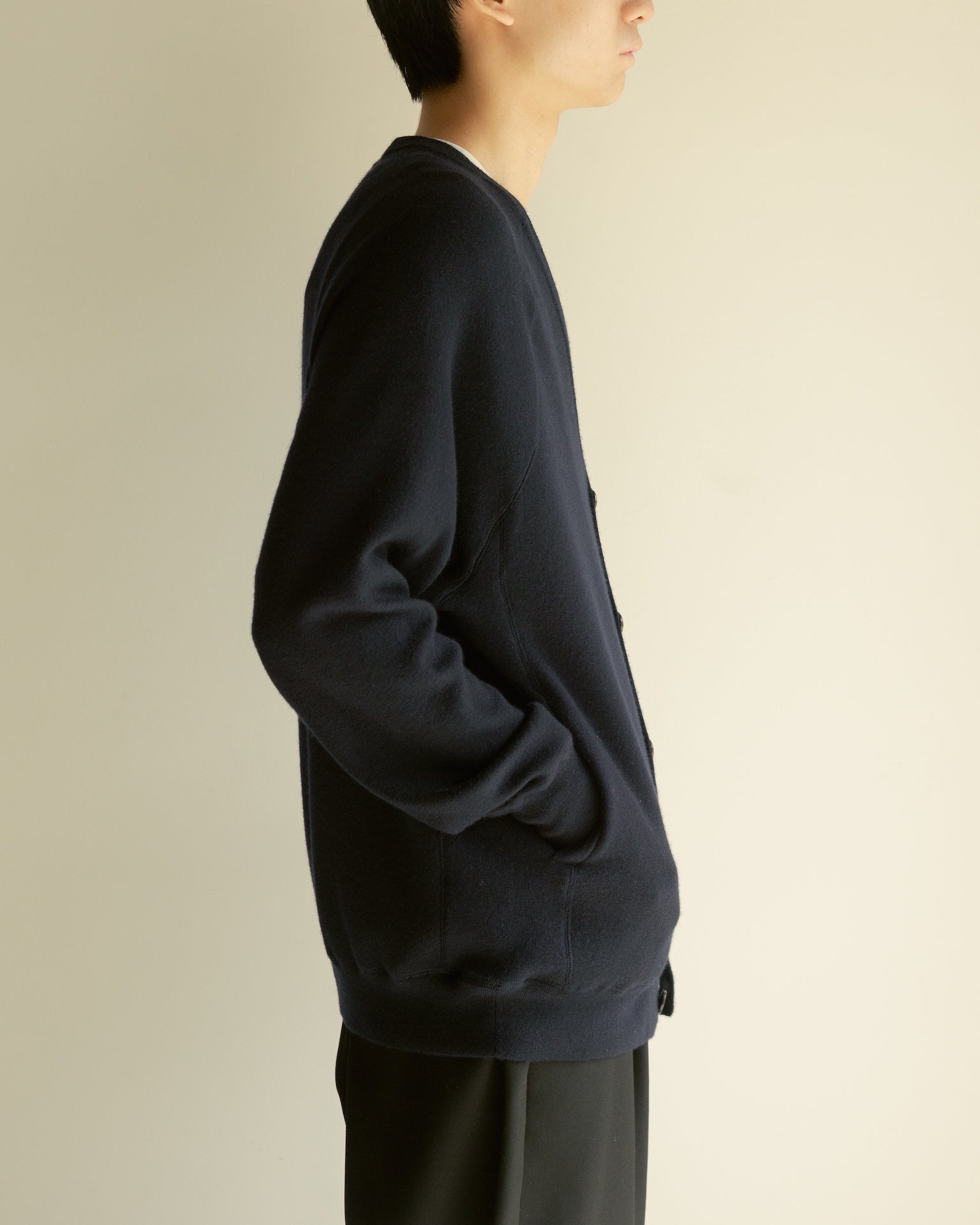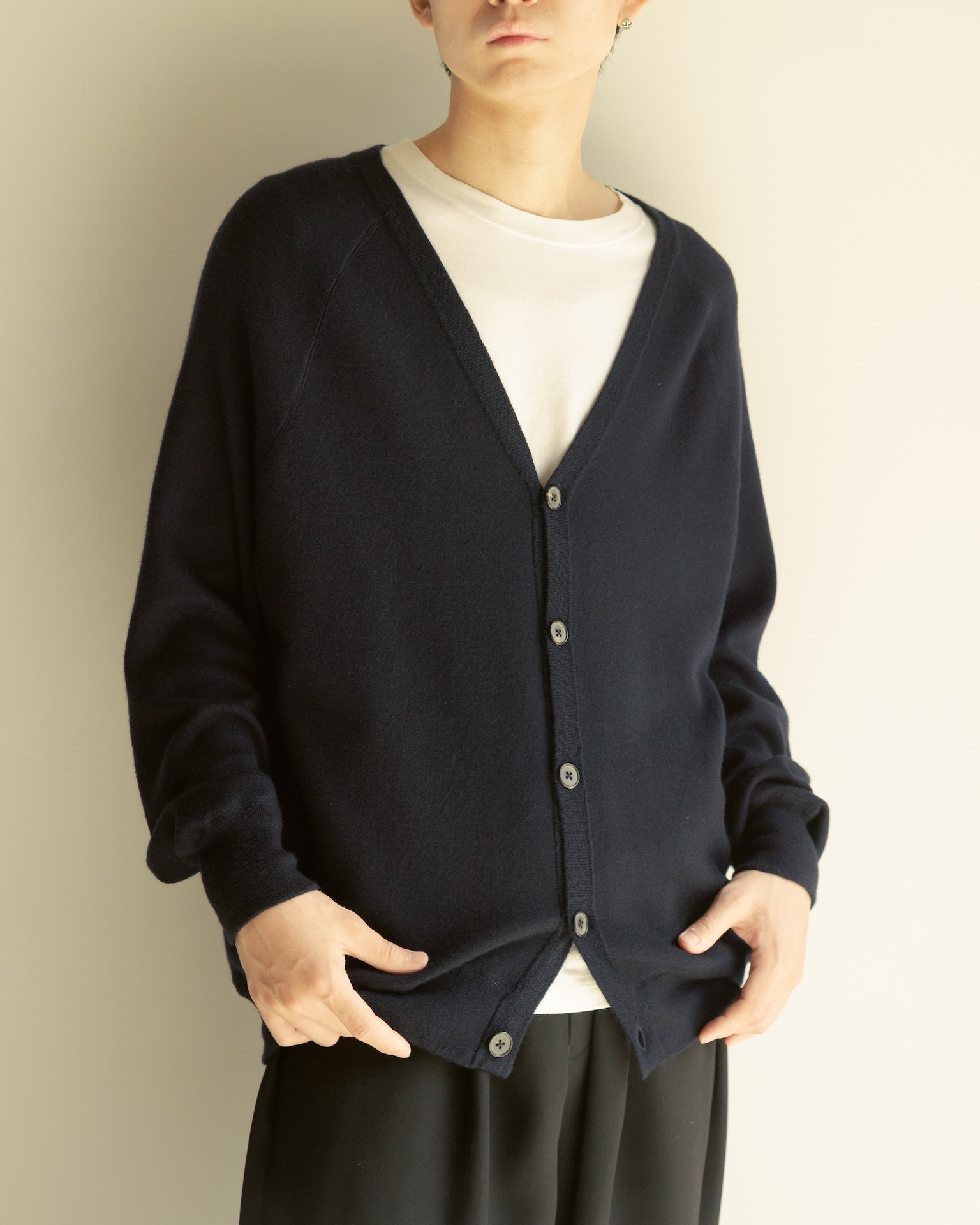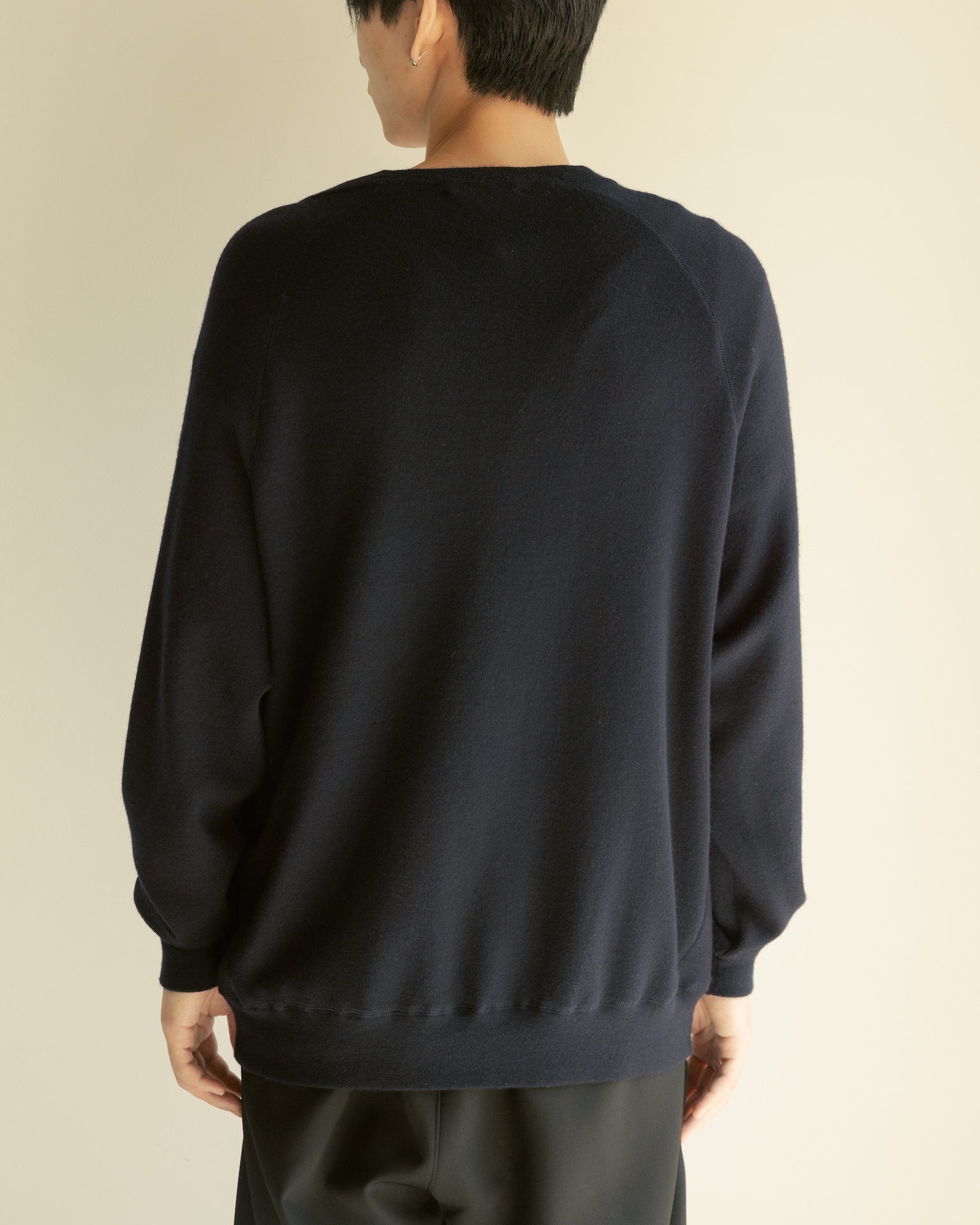100%カシミヤによる、梳毛糸(=長く細い強度のある糸)のみを選定したオリジナルハイゲージニットスウェット。ロンT以上スウェット未満を目指し、様々な環境下でも一枚で完結するオールラウンドなアイテムです。程良く肉感を持ちながら重さを感じさせず、常に身体を常温に保つ機能性は、レイヤーの一枚にとても重宝します。カシミヤ本来の性質により経年変化による劣化も少ないため、長く愛用し続けられる一品。着るほどにカシミヤに風合いが生まれ、柔らかく身体に馴染んでいきます。ボタンは水牛製で使い込むごとに艶が出てきます。ヴィンテージスウェットをベースにしたデザインは、アスレティックラグランスリーブ、サイドリブ仕様に加え前後差のない襟ぐりなどこだわりのデザインが特徴。