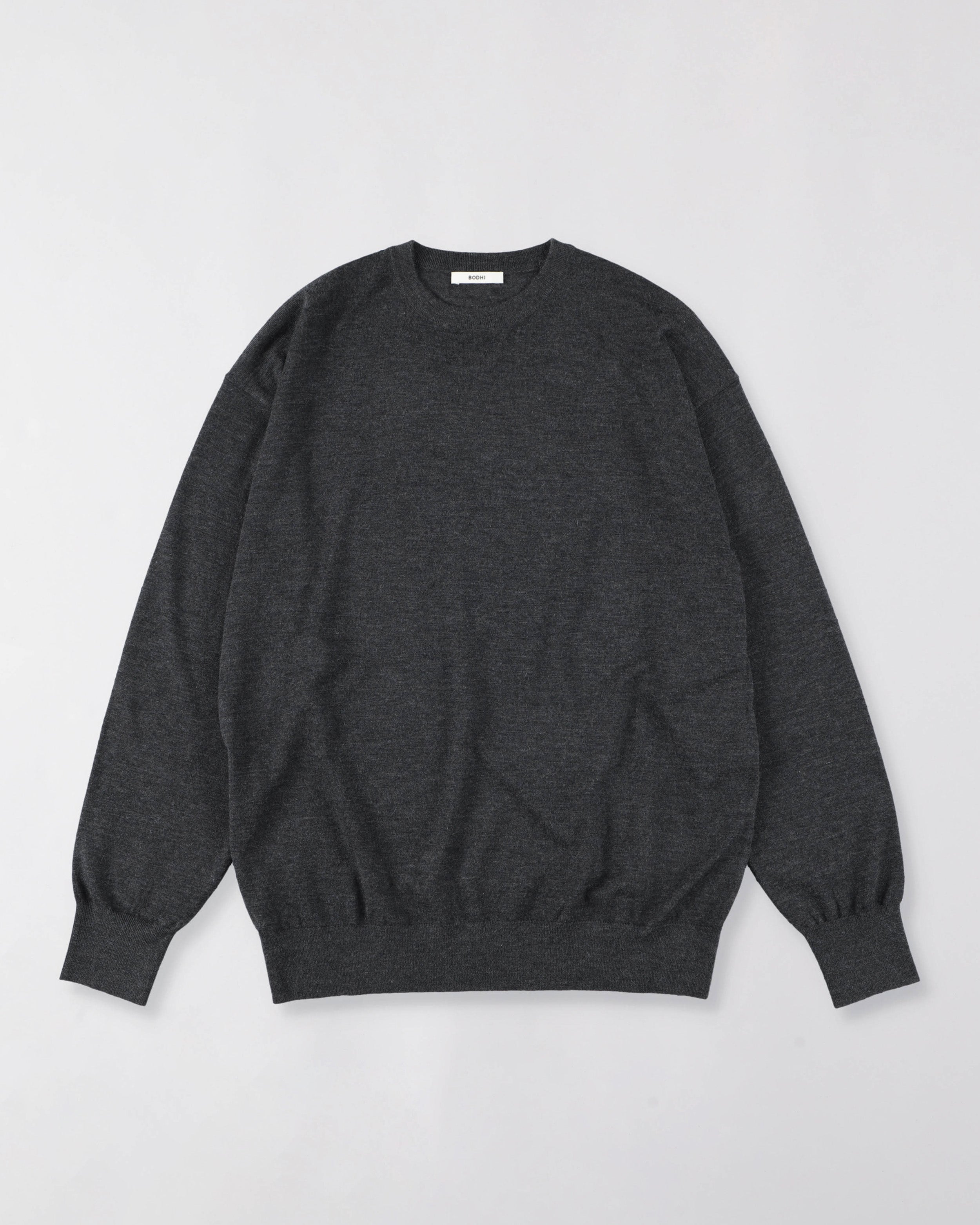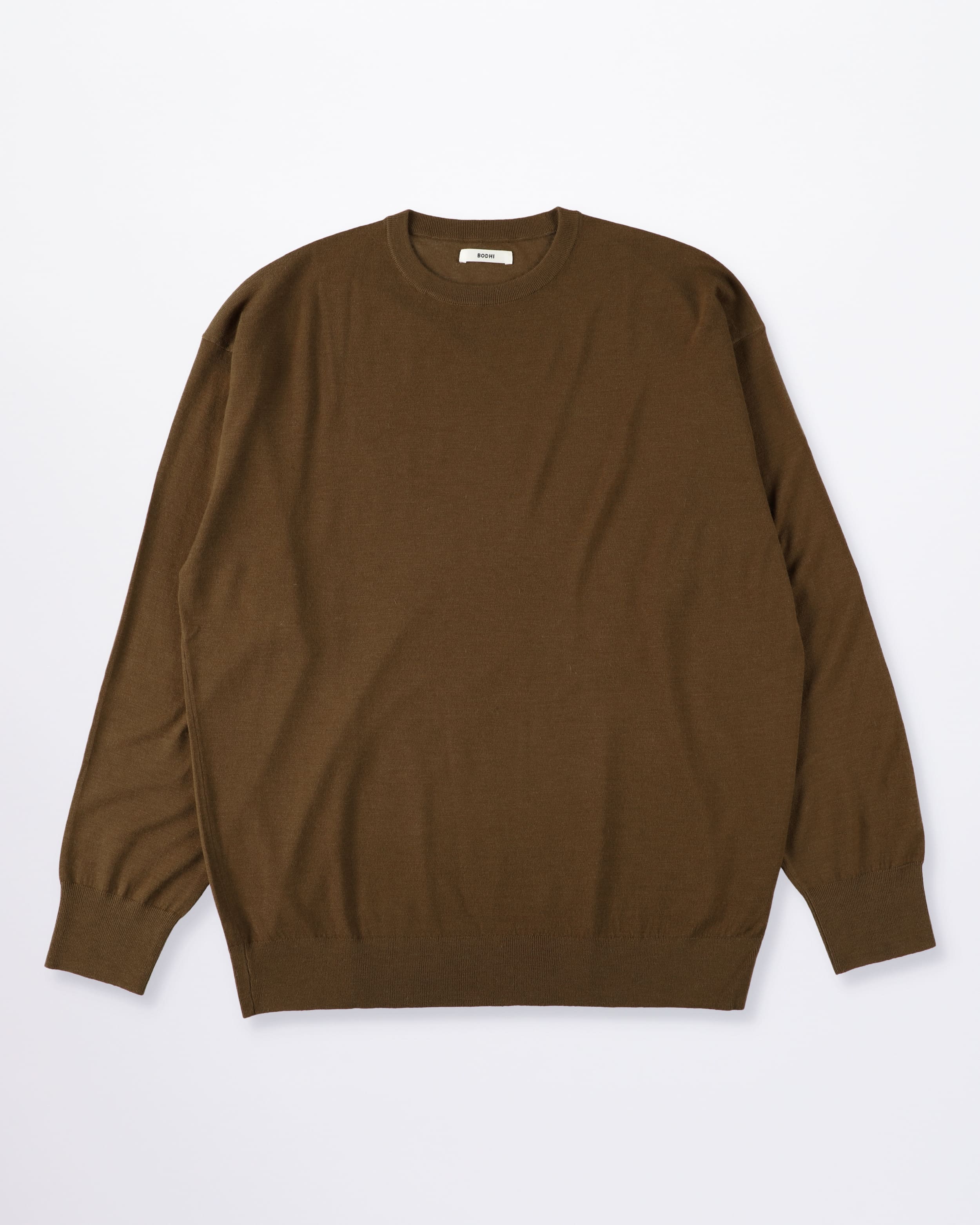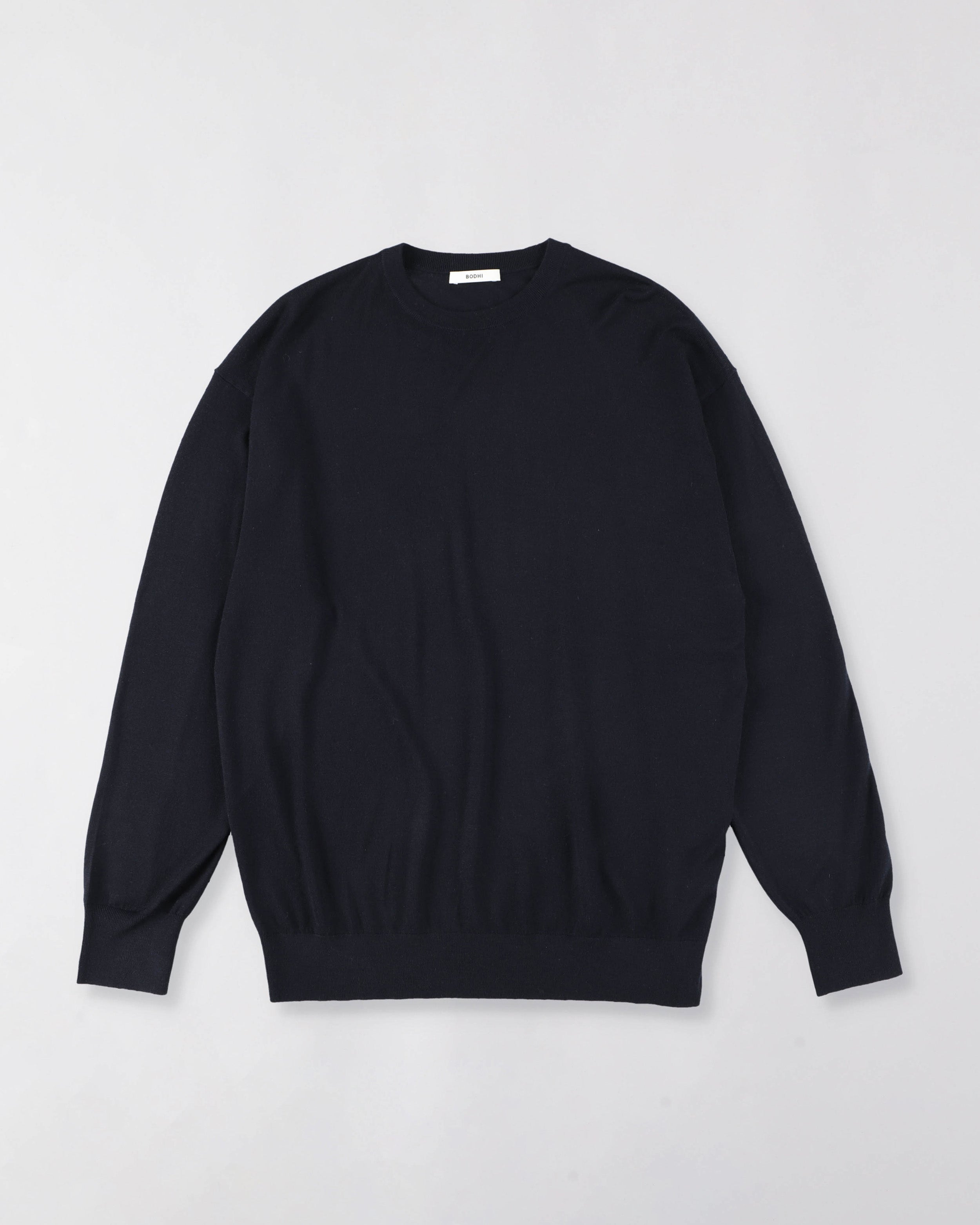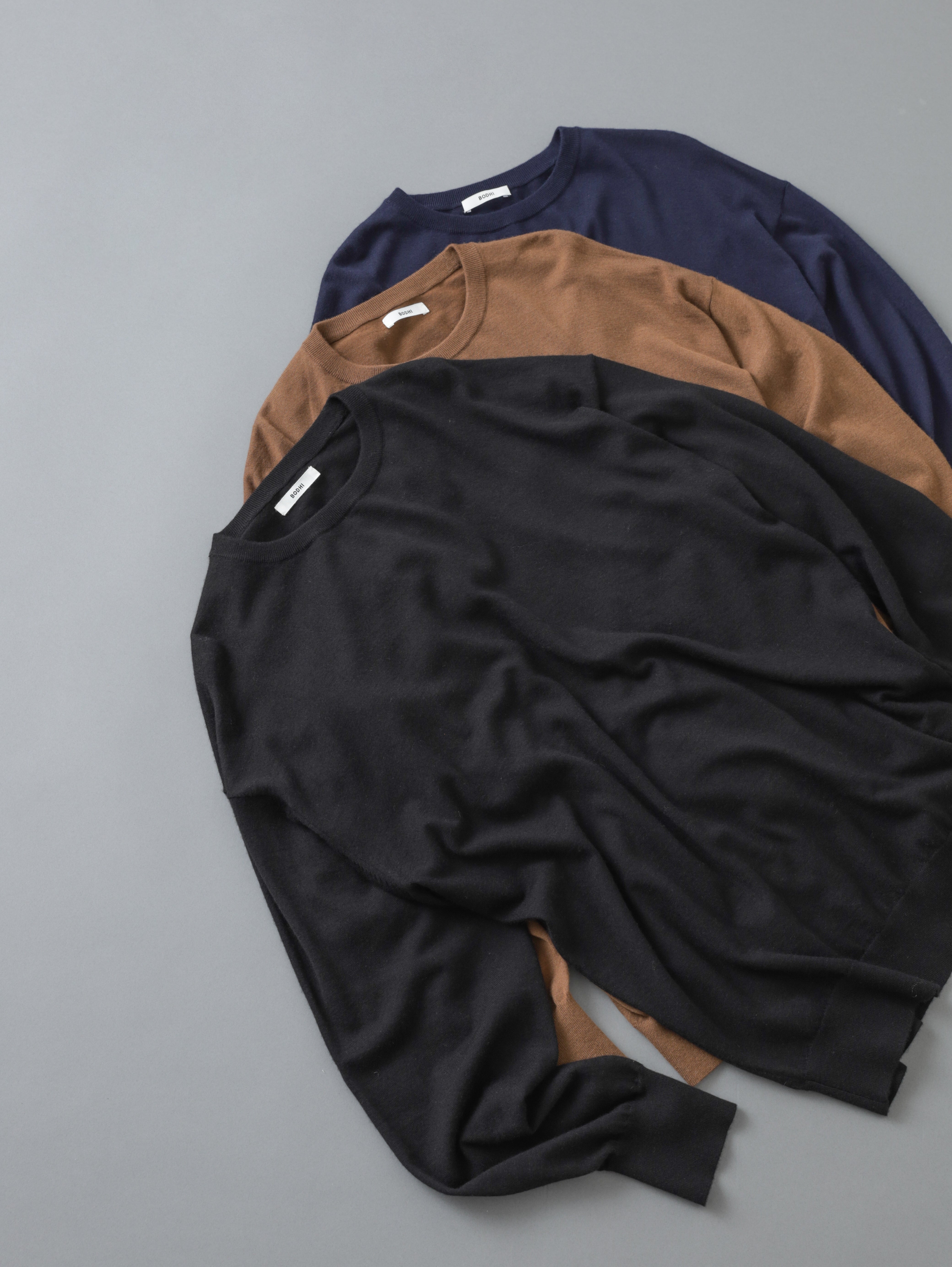 ALL-ROUND(旧MIDDLEWEIGHT)を完成させた時、冬のアイテムとしてとても良く出来た素材ですが、せっかくいい素材が出来たのだから秋から着れるようにしたい。そう思ってALL-ROUNDをベースに軽量化し改良したものがSUPERLIGHT。自分にとって大人になると言うことは、多くの人との関わりやパブリシティ、信頼や結果など、自分以外のことに責任を持って携わることが増えていくことだと思っています。 利他的に何かできることは大人である、と言っても過言ではありません。それは中身の信念だけでなく外見のマナーも同じ。身だしなみや清潔感は相手に安心感をもたらすもの。では、いかにこれまでのスタイルを変えることなく、大人になれるかを考えたい。そう模索した結果、今まで着ていたロンTが、大人になればハイゲージニットなのではないか。自分はそこに一つの答えを出したと思っています。