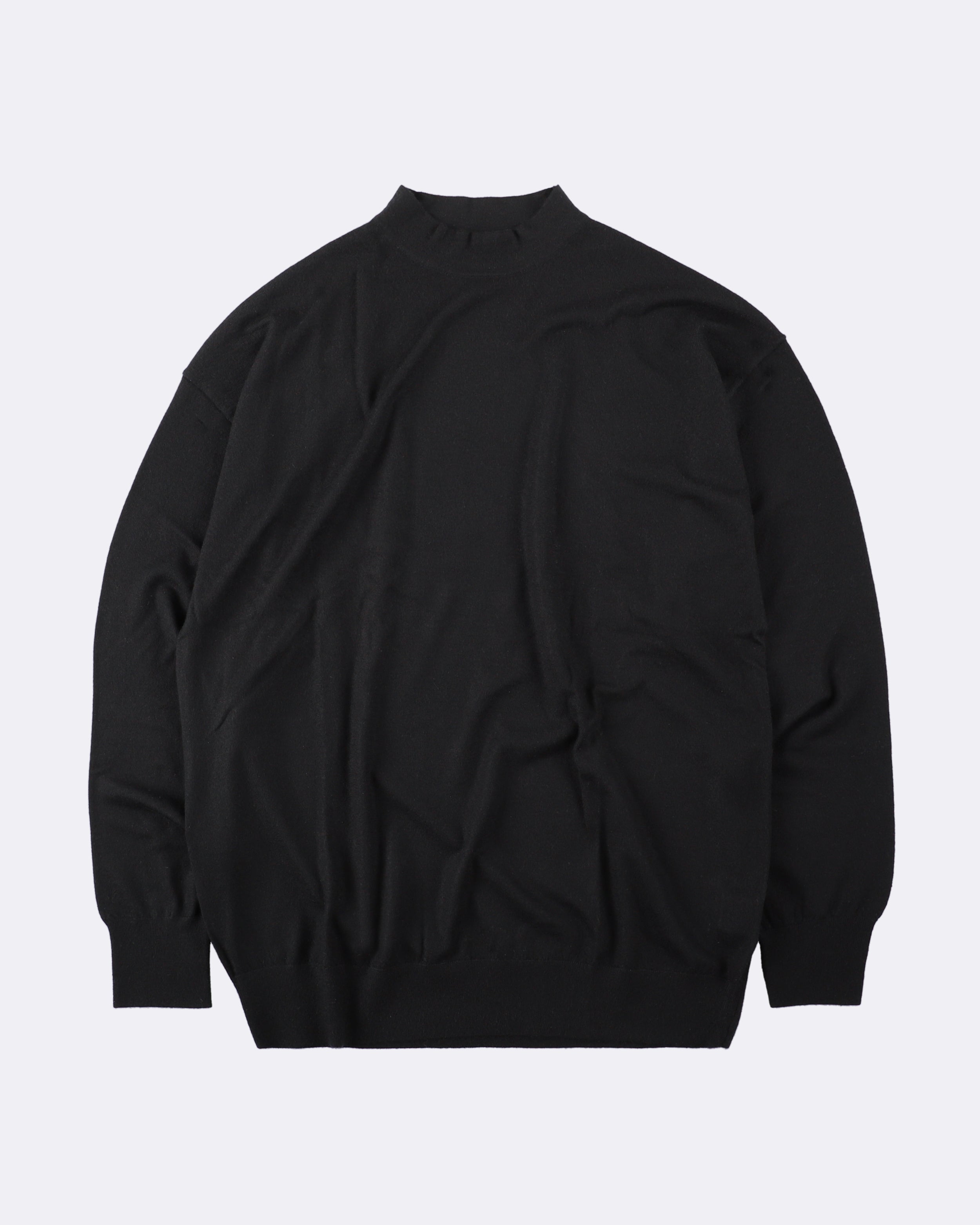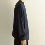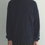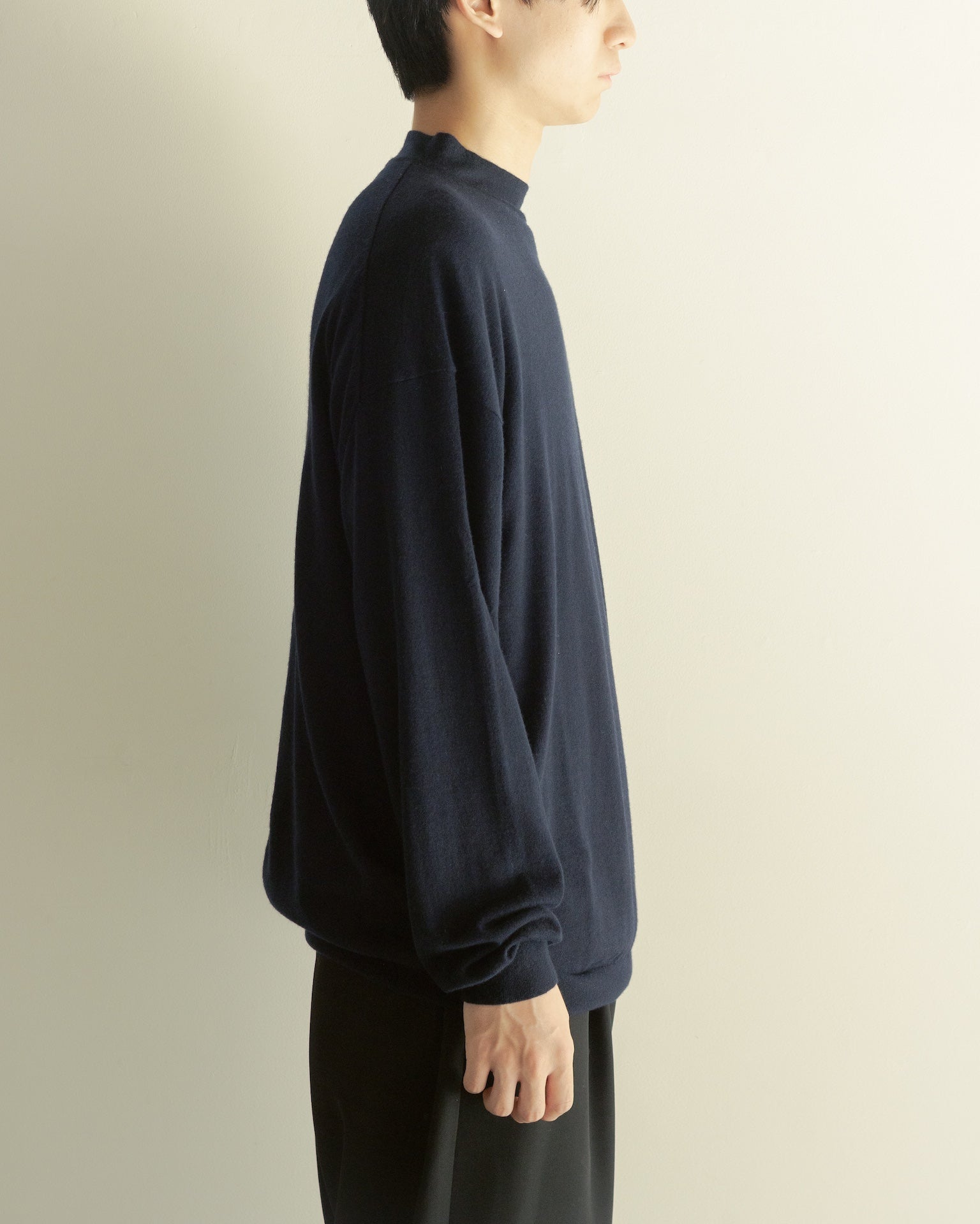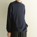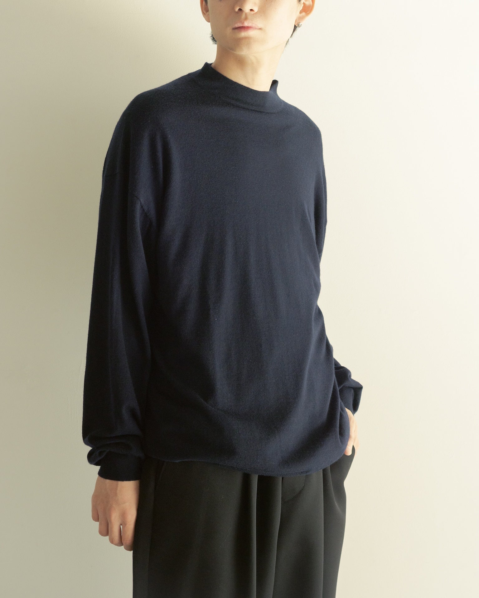 オールシーズン着用可能なカシミヤのハイゲージ天竺ニットソー。極細毛のカシミヤを通常よりもさらに強然することで保温する空気のポケットをカットし、サラッとした肌触りと着ていないような軽さを実現。ボディにフィットしやすい組織のため、身体のラインが出にくいようなリラックスシルエットを製作し取り入れています。袖はあえてロンT感覚で着用するような長めの設計。リブなどの折り曲げてもスタイルになるデザインを施しています。
