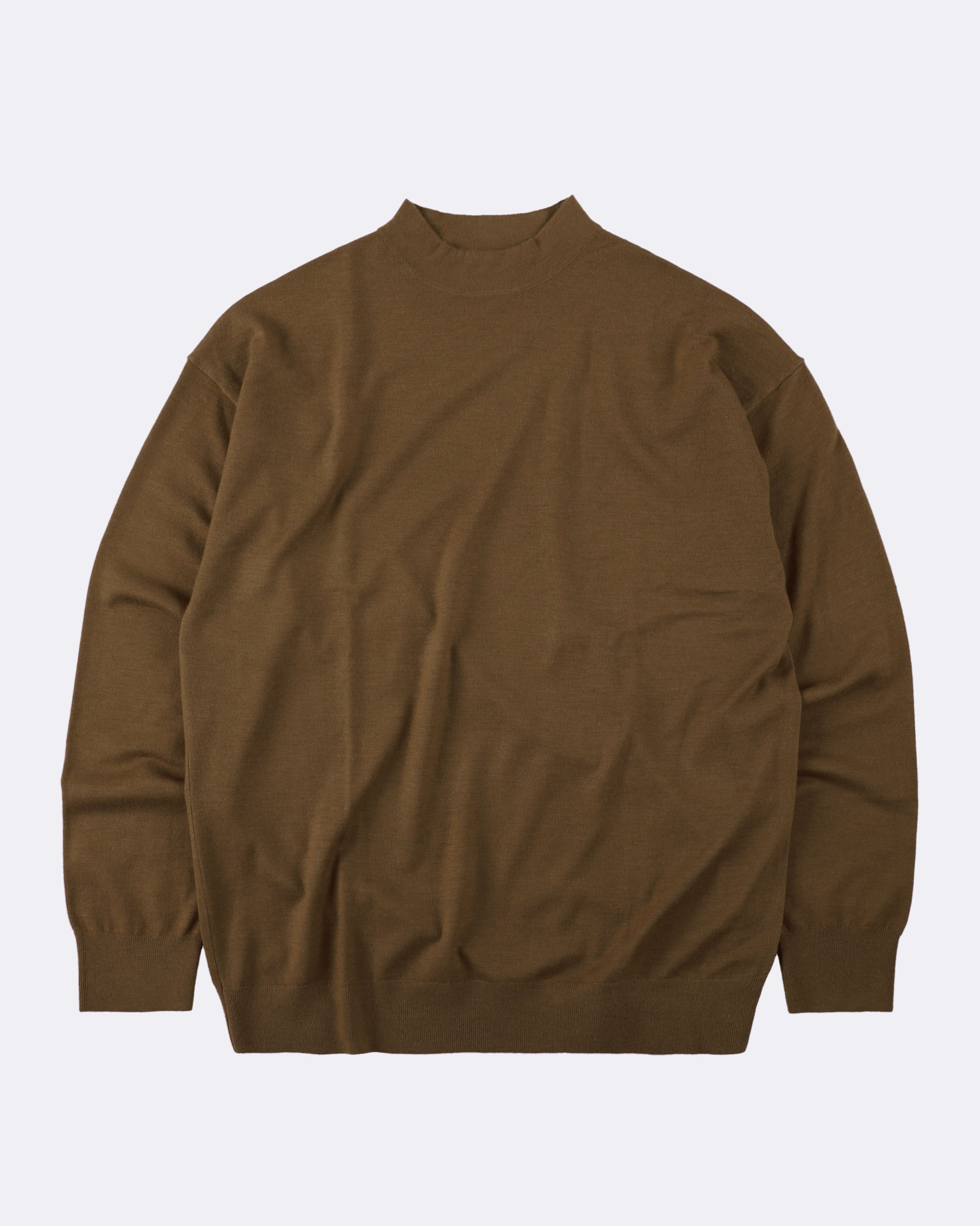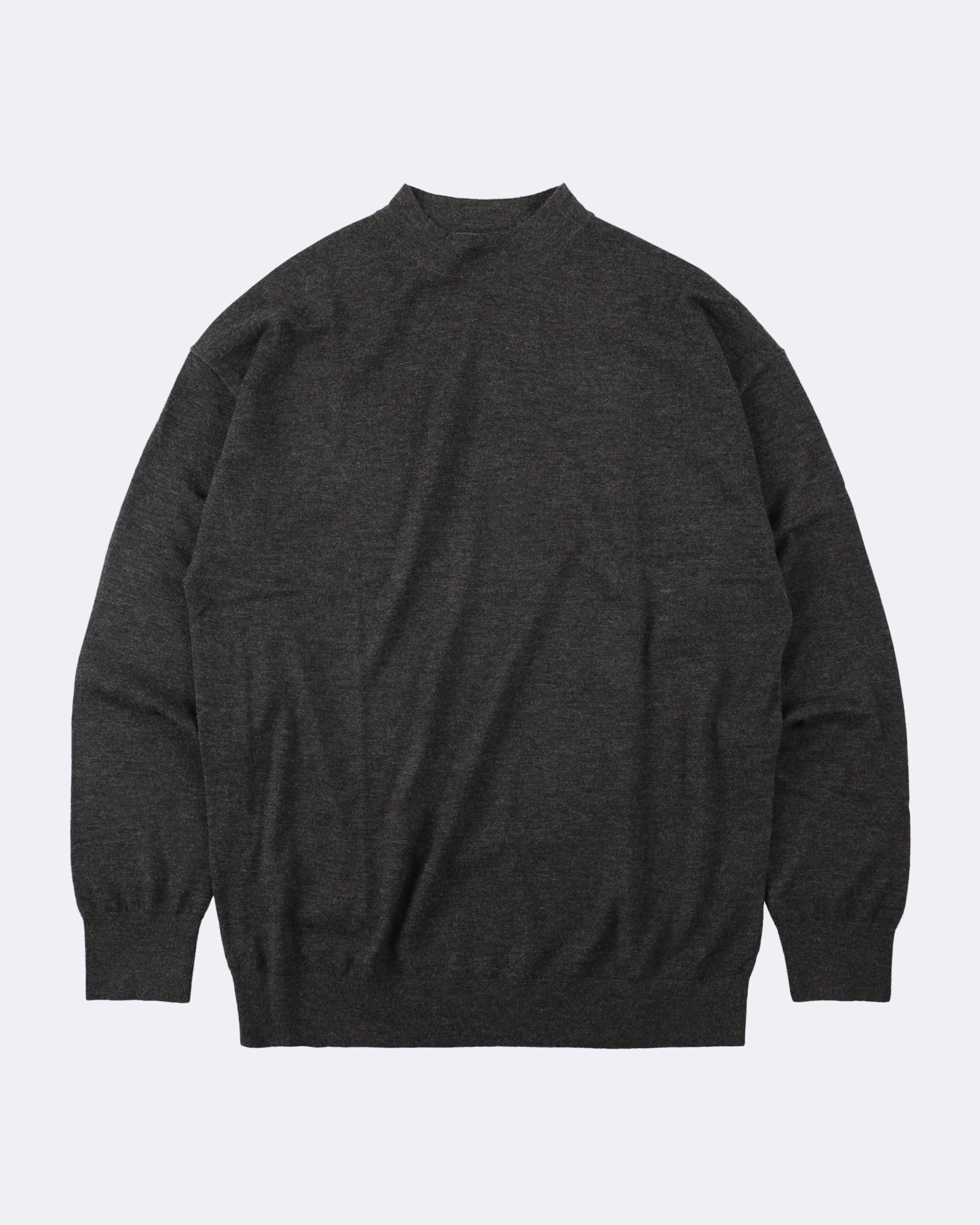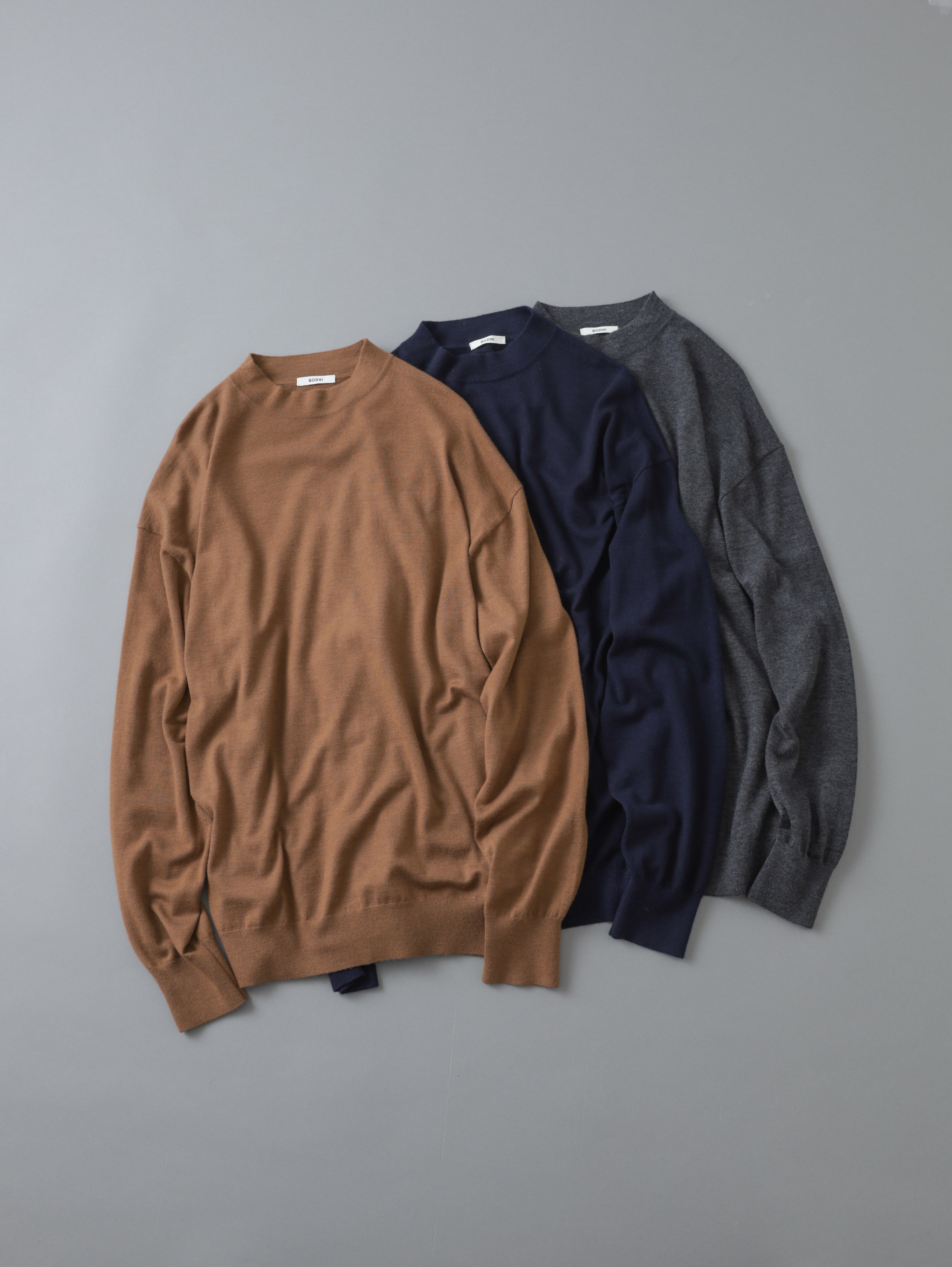 ALL-ROUND(旧MIDDLEWEIGHT)を完成させた時、冬のアイテムとしてとても良く出来た素材ですが、せっかくいい素材が出来たのだから秋から着れるようにしたい。そう思ってALL-ROUNDをベースに軽量化し改良したものがSUPERLIGHT。自分にとって大人になると言うことは、多くの人との関わりやパブリシティ、信頼や結果など、自分以外のことに責任を持って携わることが増えていくことだと思っています。 利他的に何かできることは大人である、と言っても過言ではありません。それは中身の信念だけでなく外見のマナーも同じ。身だしなみや清潔感は相手に安心感をもたらすもの。では、いかにこれまでのスタイルを変えることなく、大人になれるかを考えたい。そう模索した結果、今まで着ていたロンTが、大人になればハイゲージニットなのではないか。自分はそこに一つの答えを出したと思っています。